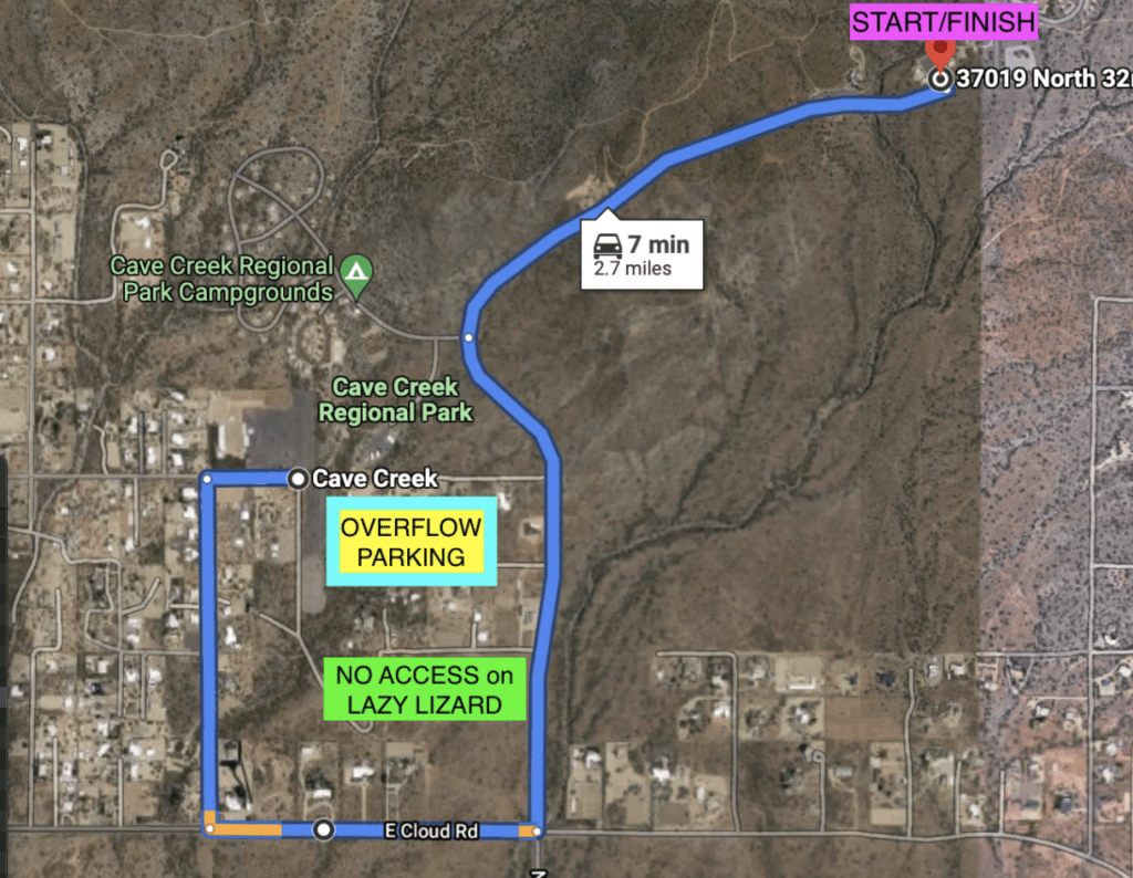 The finish line is located at the Group Picnic Area within Cave Creek Regional Park. Overflow parking will be available in portions of the horse staging area parking lot or around the Tonalite Drive Loop approximately 1/4 mile from the start/finish area. We are not allowed to park at the Visitor Center.