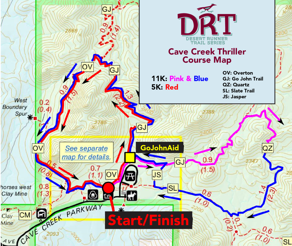 50K and 24K and 5K Runners: Parking is at Cave Creek Regional Park. There is NO PARKING at the Visitor Center or along the road inside the park! The park charges $7 for a day pass and won’t be selling annual passes during your entry. Please bring exact change or your park pass for expediting everyone’s entry into the park.